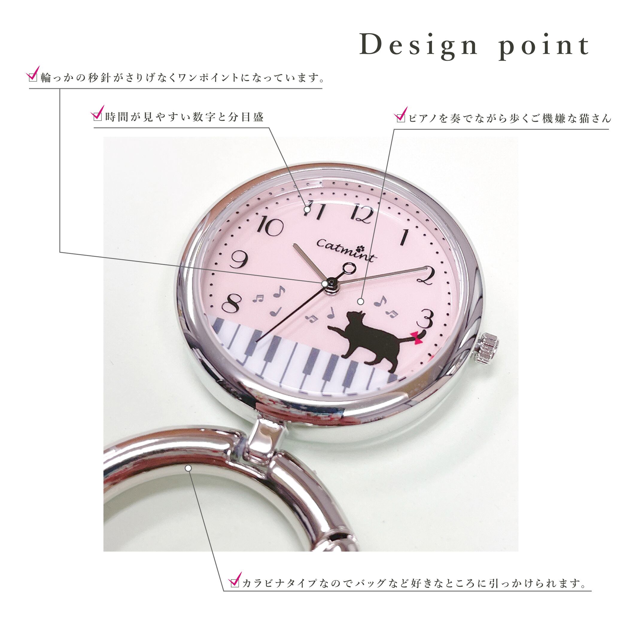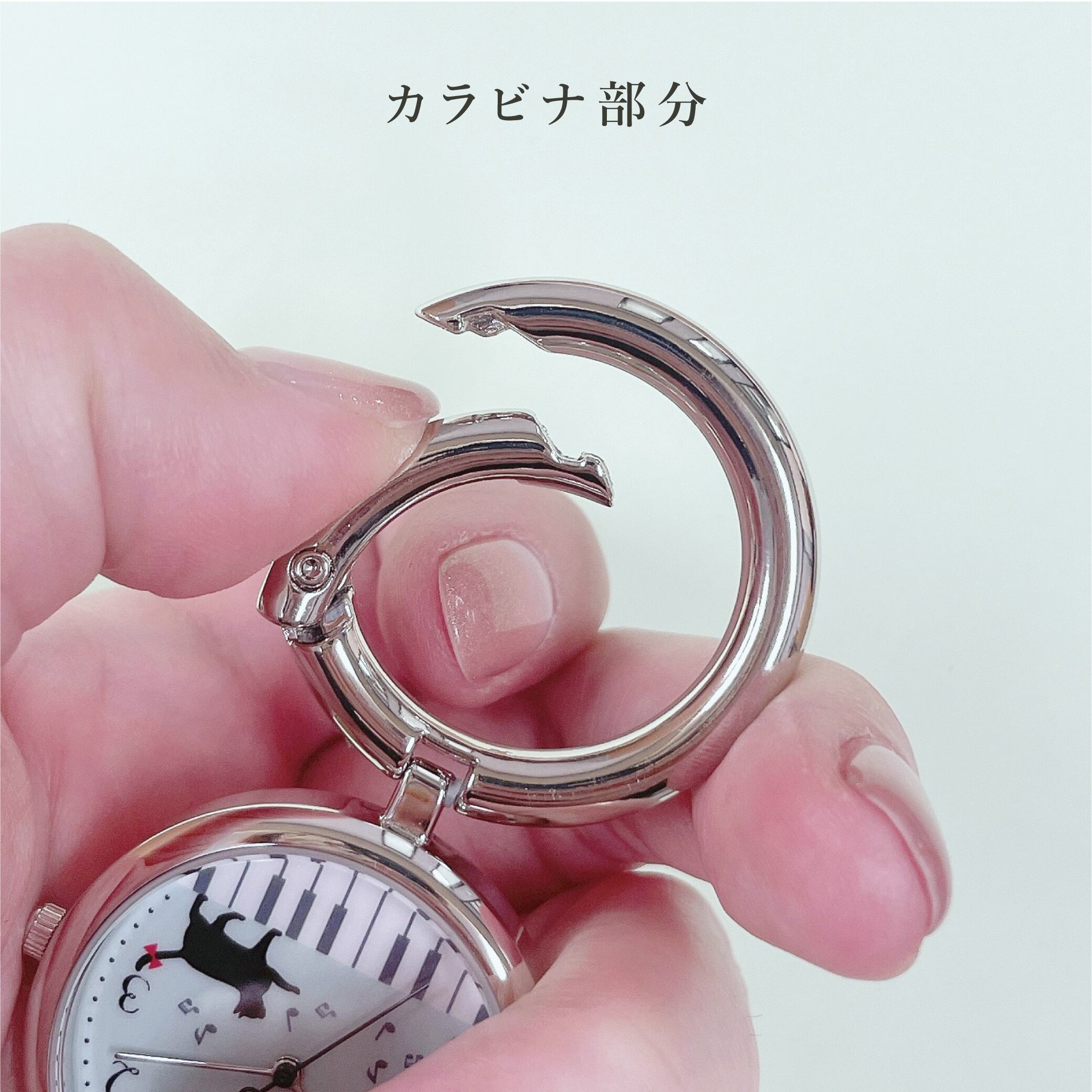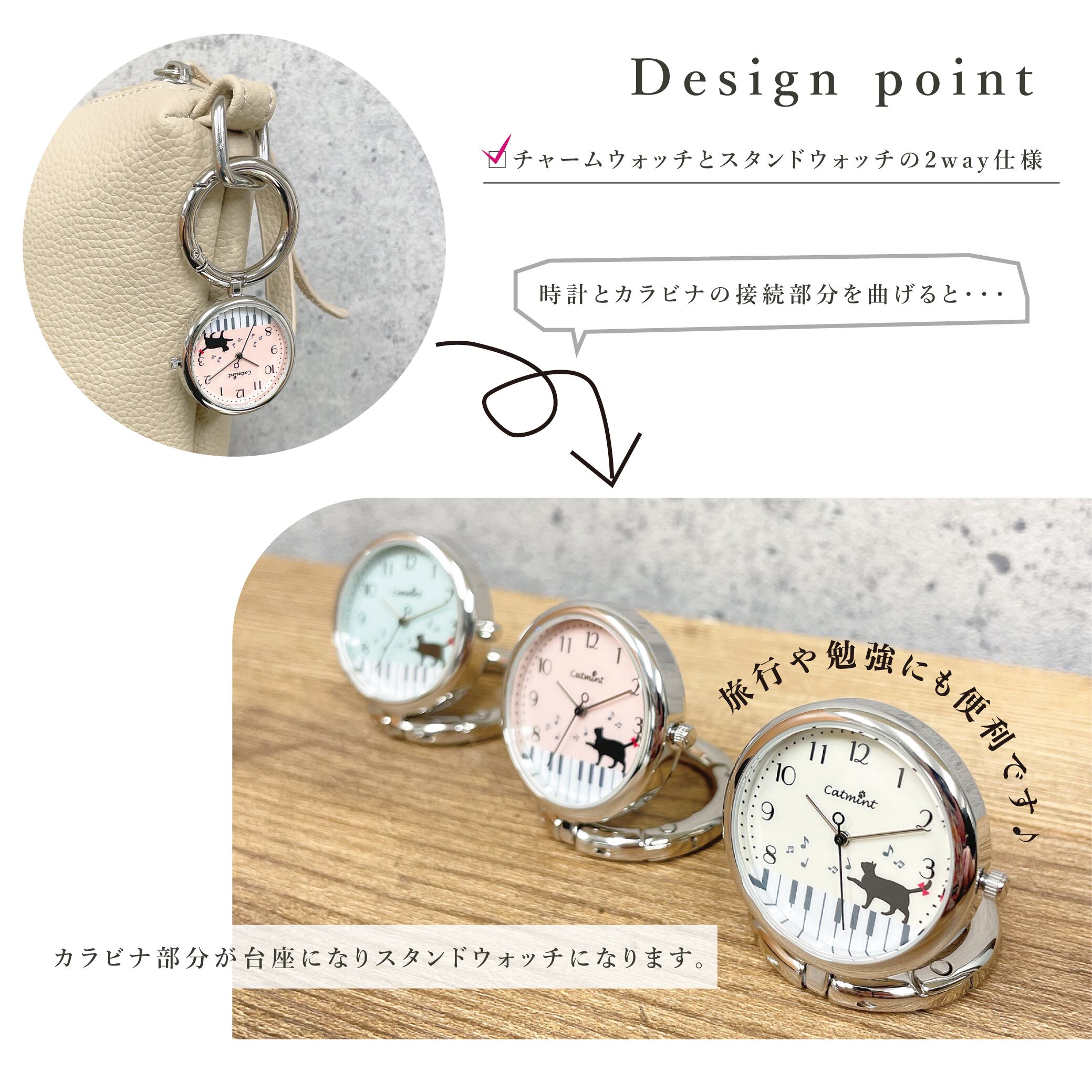 *・.猫のイラスト文字盤が可愛い2way仕様のチャームウォッチです。カラビナ部分が台座になりスタンドウォッチにもなるので旅行や勉強にもおすすめです.・*