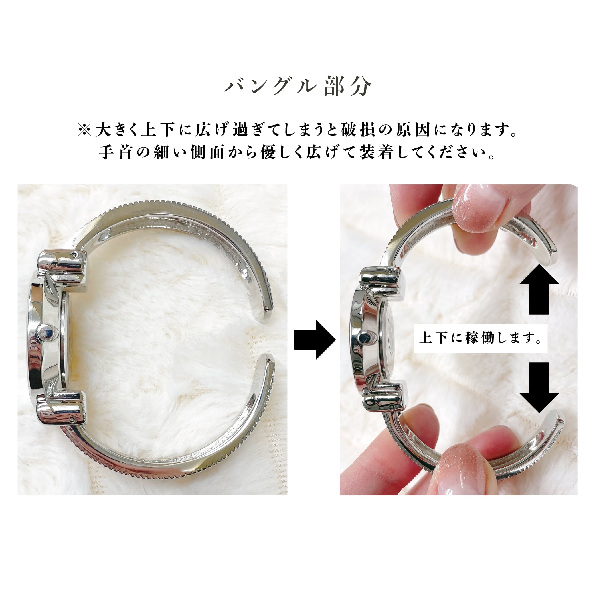 バングルは大きく広げてしまうと破損の原因になります。