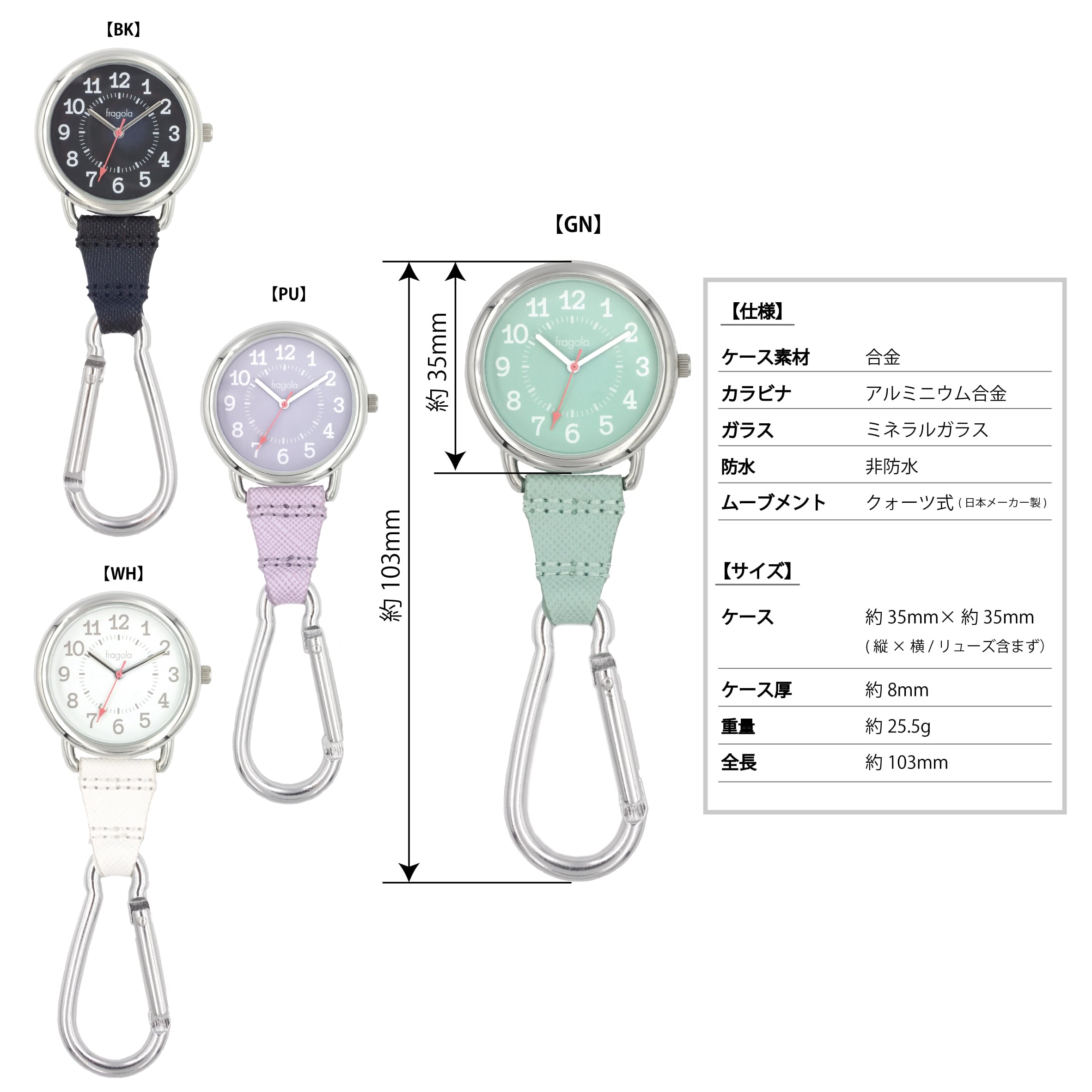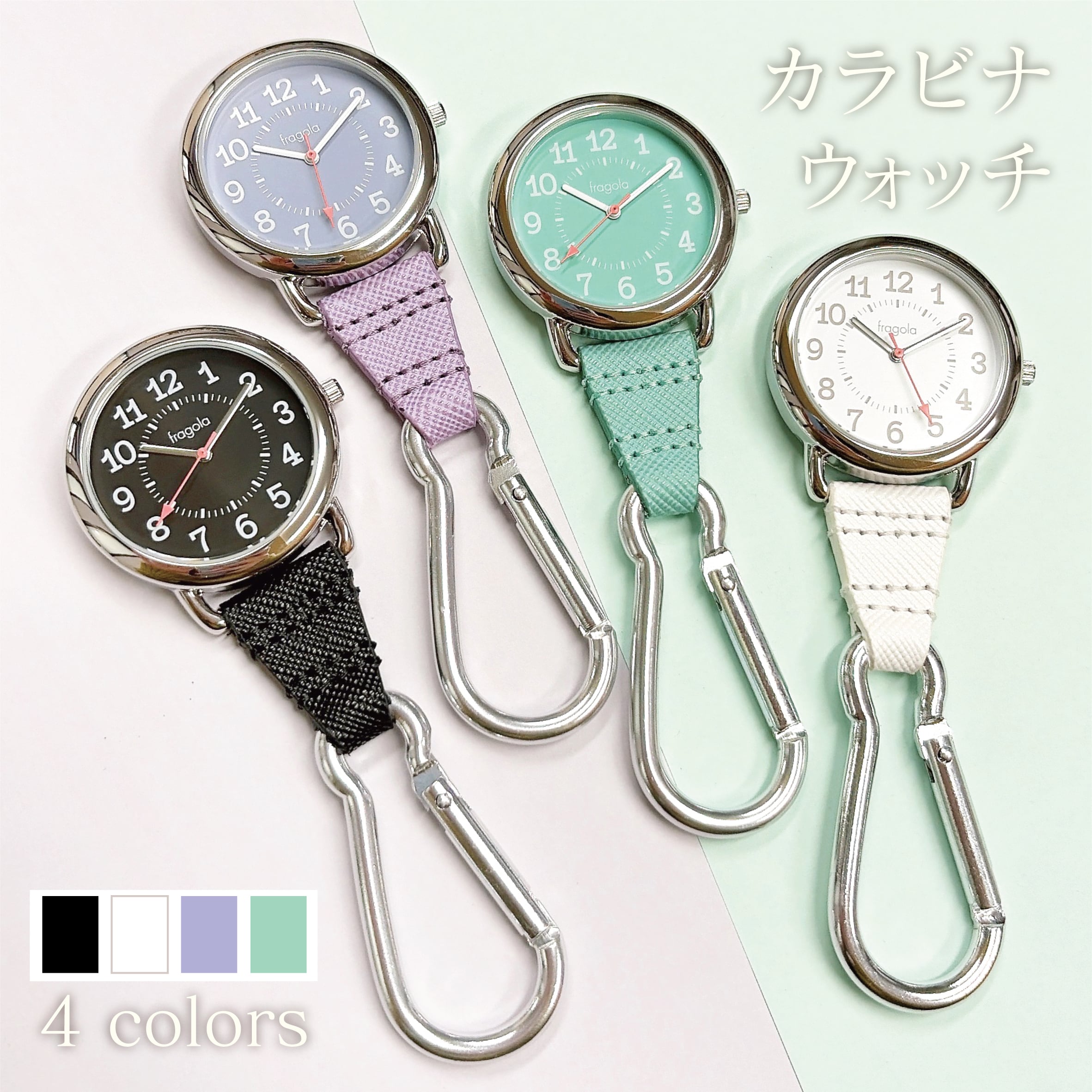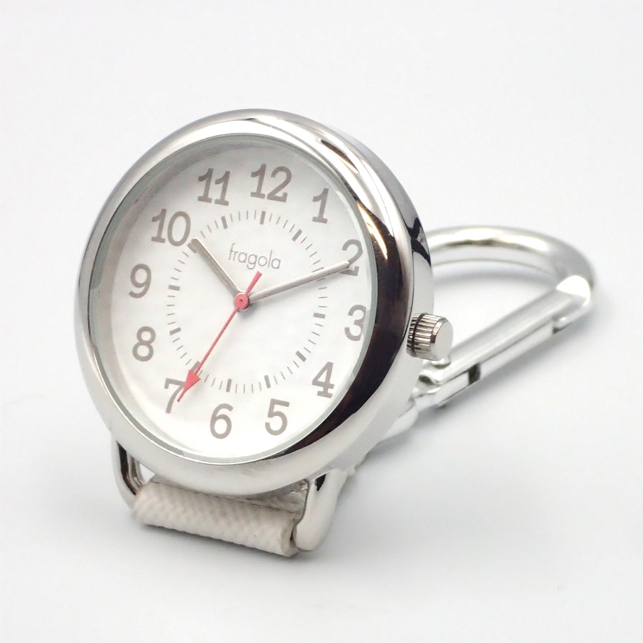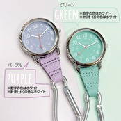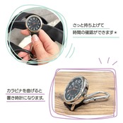 大きめのカラビナがついた便利なチャームウォッチです。